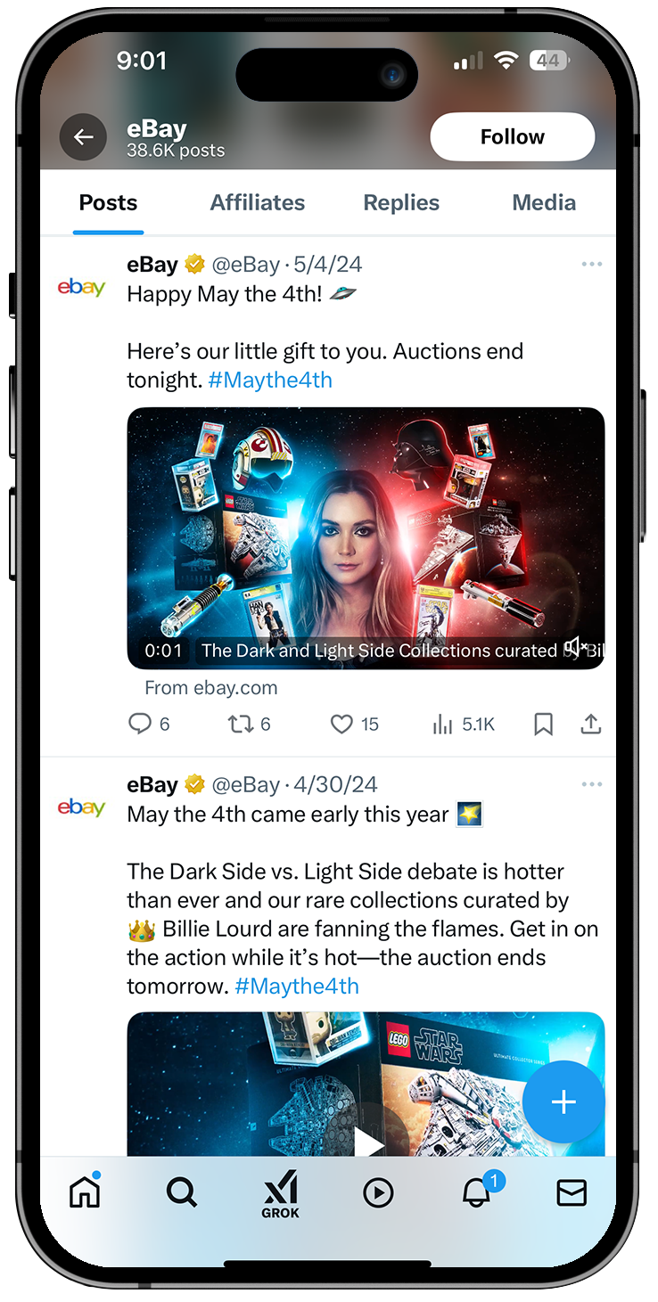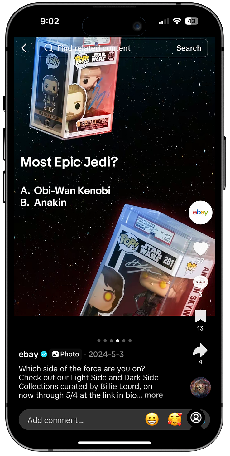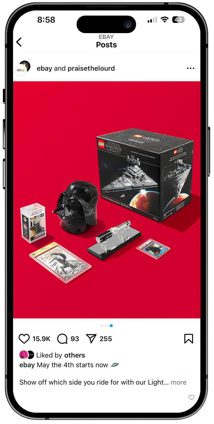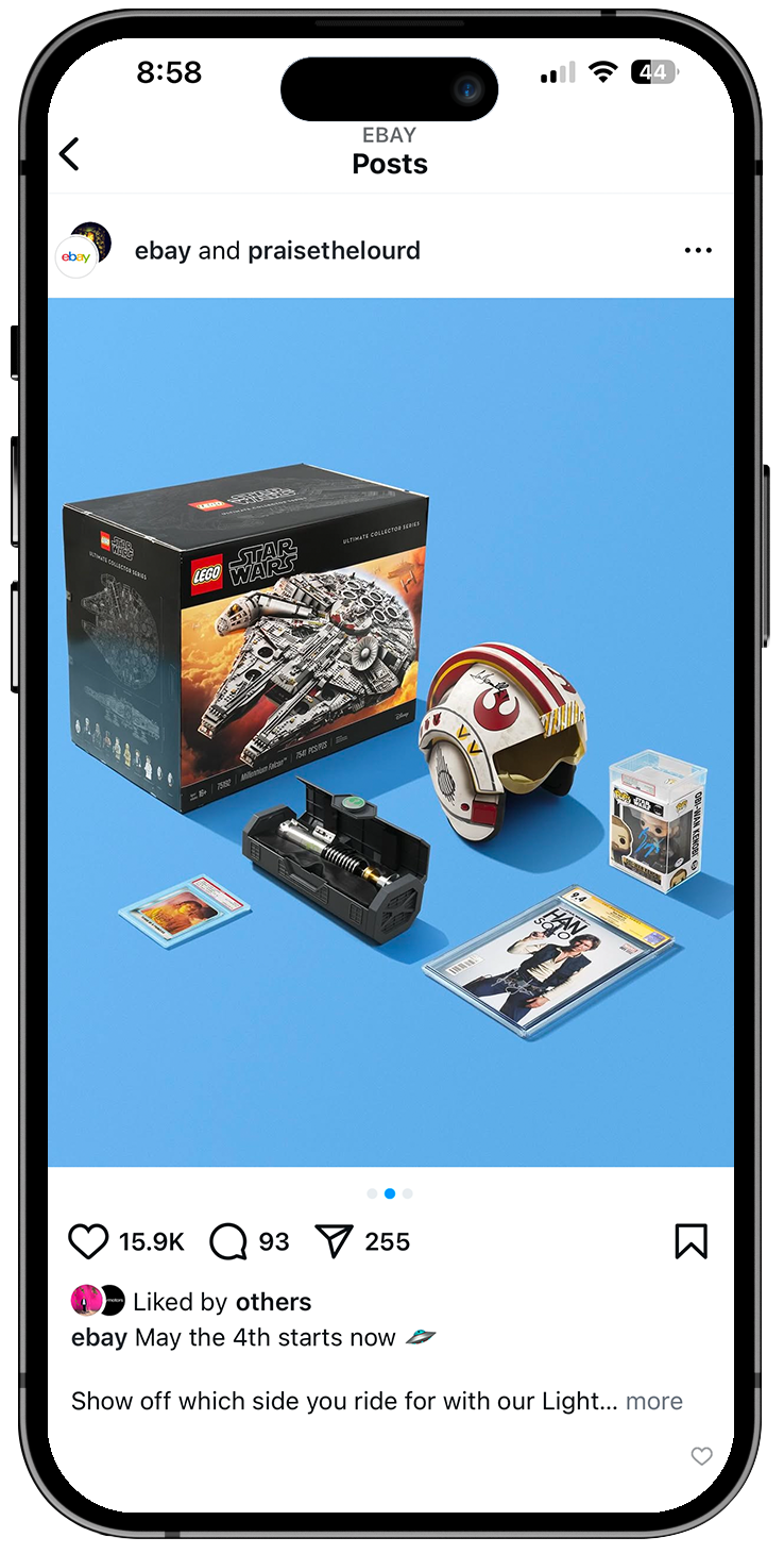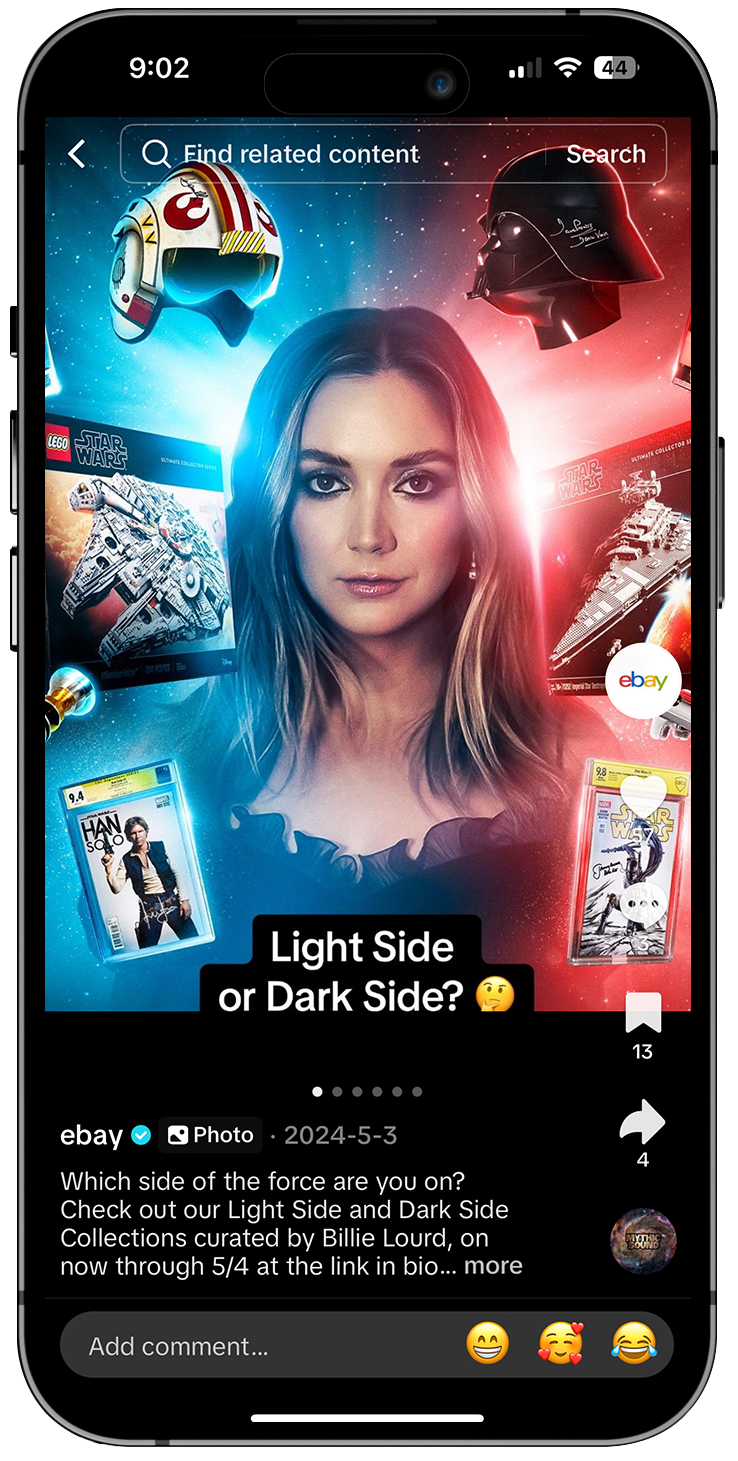 To celebrate Star Wars Day on May the Fourth, we launched Your Side of the Fourth, a pair of collectible storefronts designed to fuel both Light Side and Dark Side fandoms. As anticipation around the holiday builds each year, we tapped into eBay’s deep Star Wars marketplace to curate rare, iconic items spanning the franchise’s history. The collections were curated by actress Billie Lourd and invited fans to choose their allegiance through two opposing storefronts, each featuring ultra-rare auction items. Highlights included a Mark Hamill signed Luke Skywalker lightsaber hilt, a Carrie Fisher signed 1980 trading card, and a David Prowse signed Darth Vader helmet, with bidding starting at just $0.54. The campaign turned a cultural moment into a fan driven shopping experience rooted in choice, nostalgia, and the thrill of the auction.